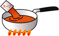 同時に別の鍋にお湯(1食分280cc)とスープ、背脂(レトルト)を入れて、一度軽く沸騰させて火を止める。これがおいしさのコツです!